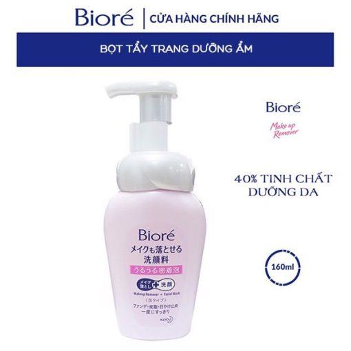 Bọt Tẩy Trang Dưỡng Ẩm Bioré Make Up Remover Foaming  bọt tẩy trang  với kết cấu bọt tạo sẵn tiện lợi giúp làm lớp trang điểm mỏng và cấp ẩm cho da hiệu quả, mang lại cảm giác tươi mát cho làn da ngay sau khi làm sạch. Với công thức chứa 40% tinh chất dưỡng da giúp tăng cường sự ẩm mịn cho da thuộc thương hiệu Bioré đến từ tập đoàn Kao Corporation Nhật Bản.