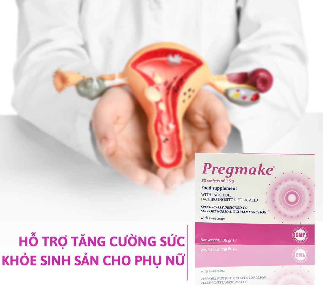 Bột uống hỗ trợ sức khỏe sinh sản nữ giới Pregmake giúp điều hòa kinh nguyệt, cân bằng hormone, ngăn vô sinh ở nữ giới. Sản phẩm đồng thời còn hỗ trợ tăng khả năng thụ thai cho phụ nữ.