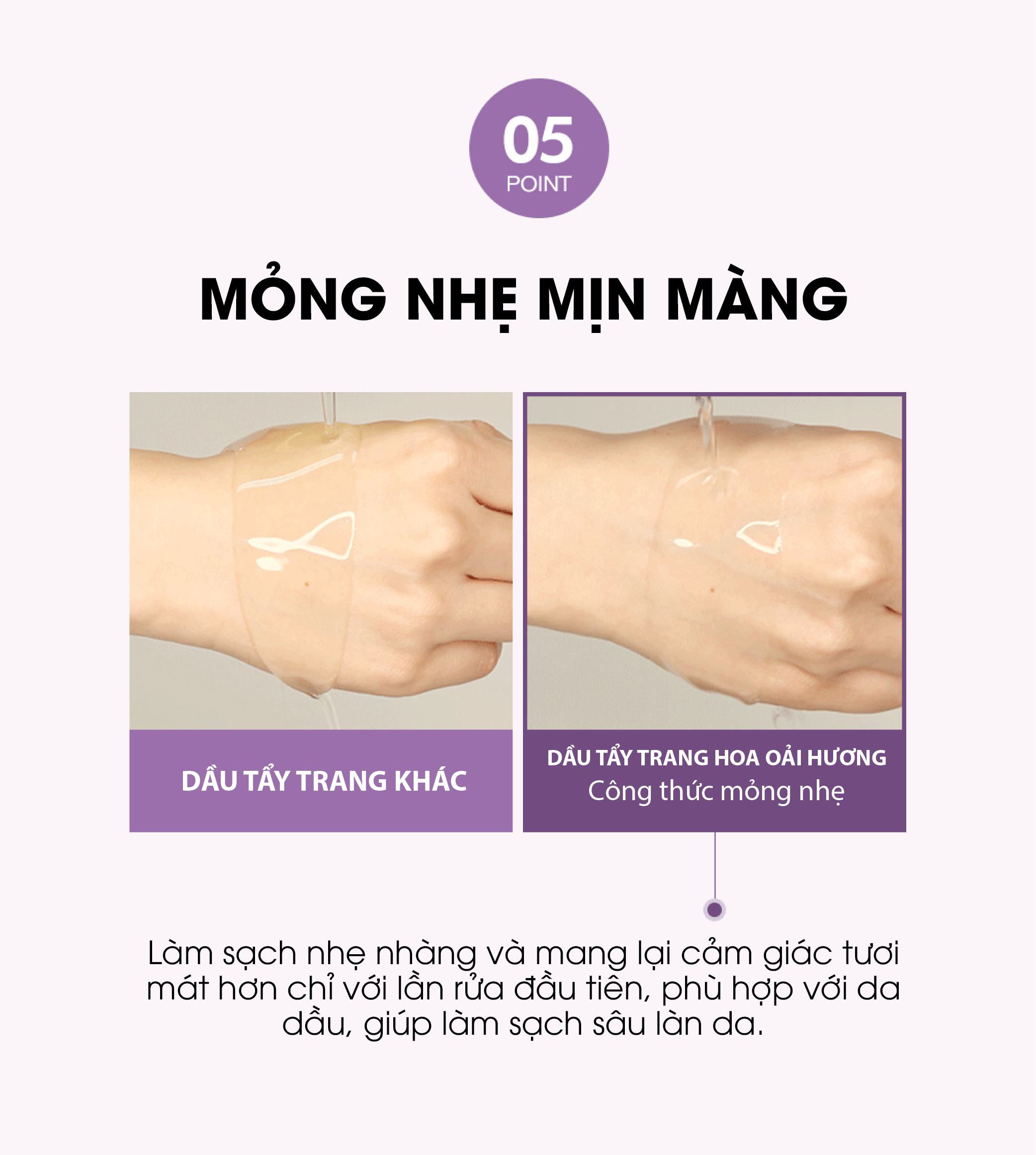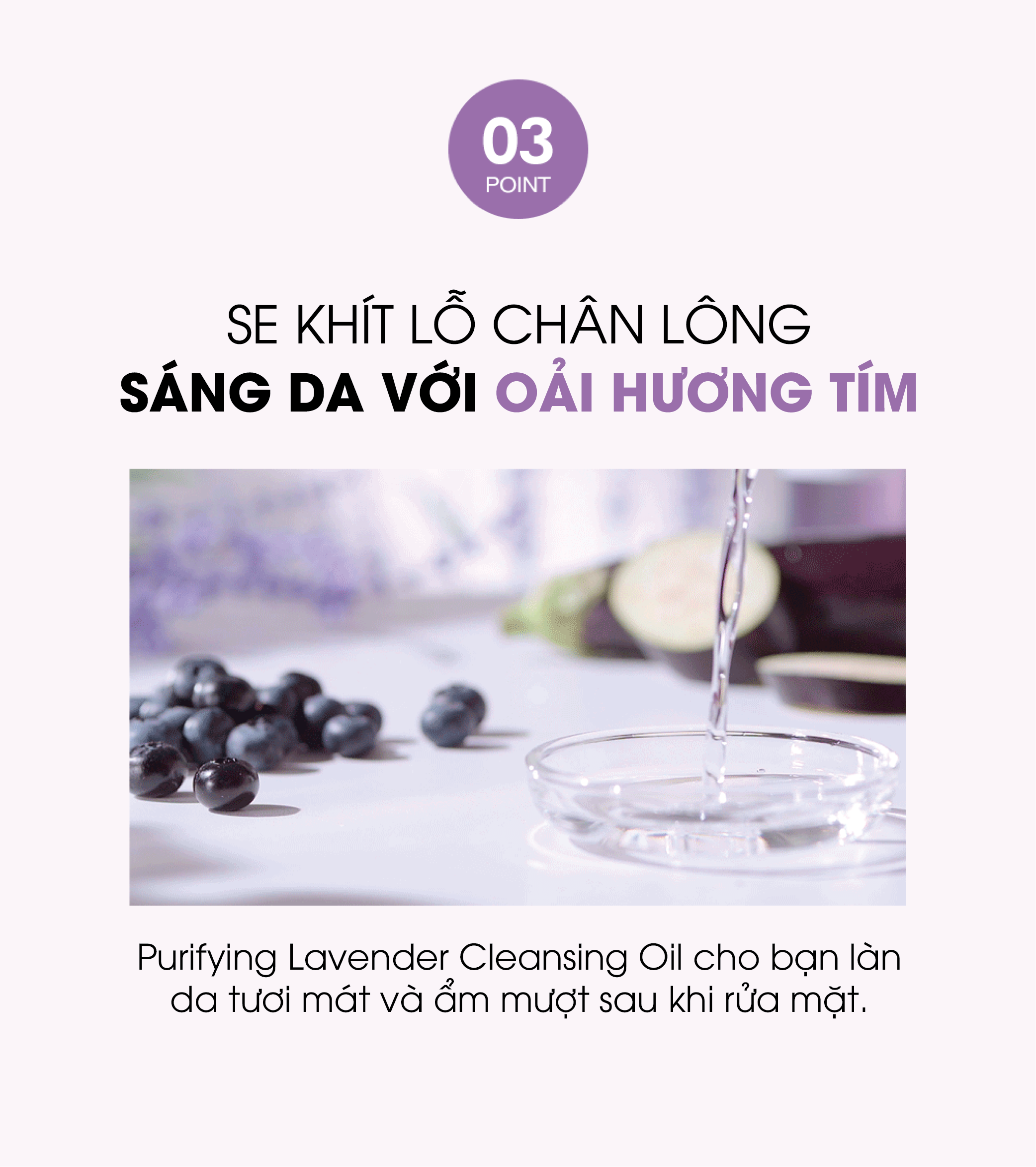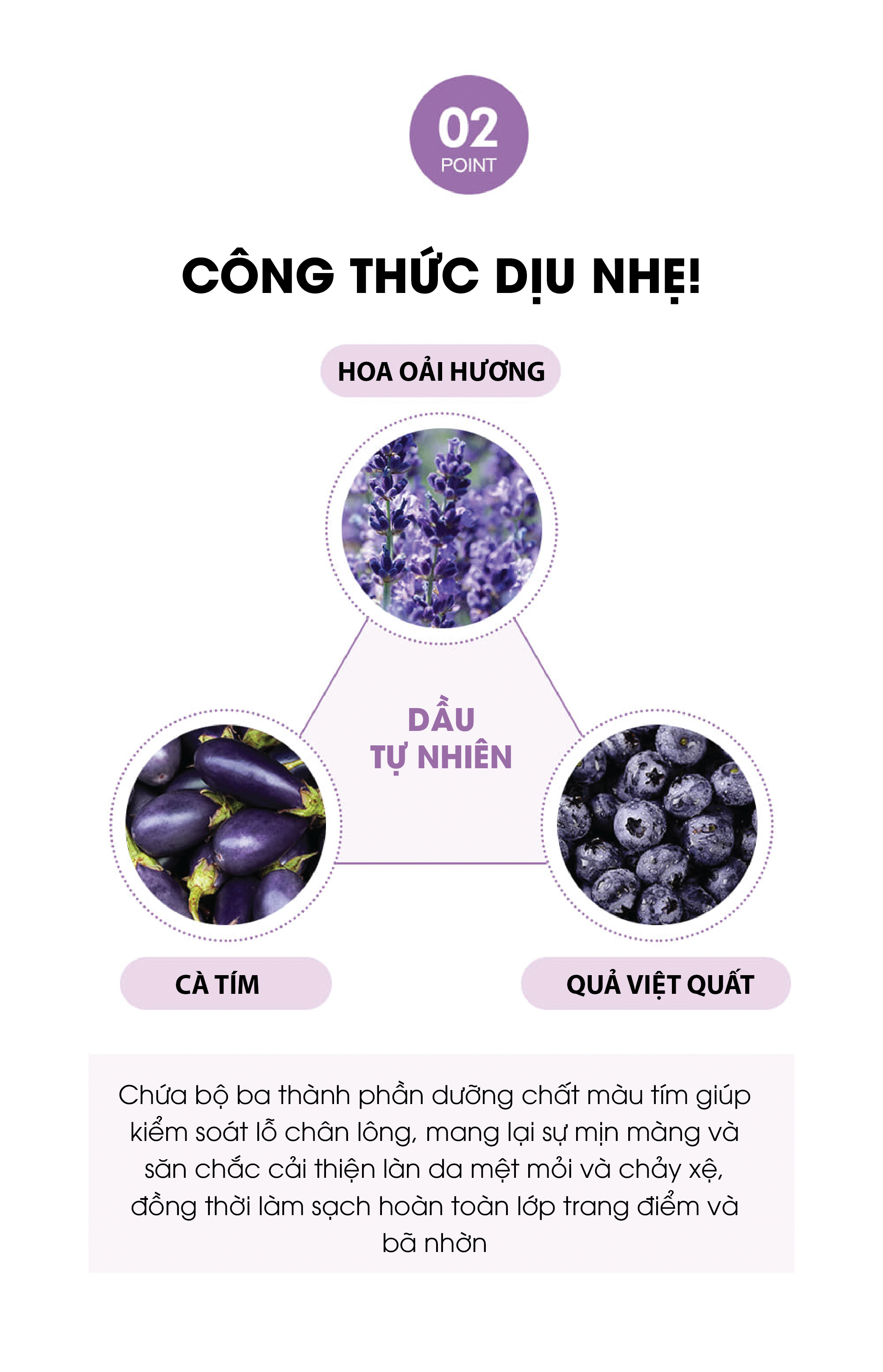 Dầu tẩy trang nhẹ nhàng loại bỏ các tạp chất sâu bên trong lỗ chân lông và ngăn ngừa mất độ ẩm. Công thức chiết xuất từ hoa oải hương, cà tím và việt quất giúp làm dịu da và thúc đẩy độ đàn hồi. Thích hợp cho da dầu.