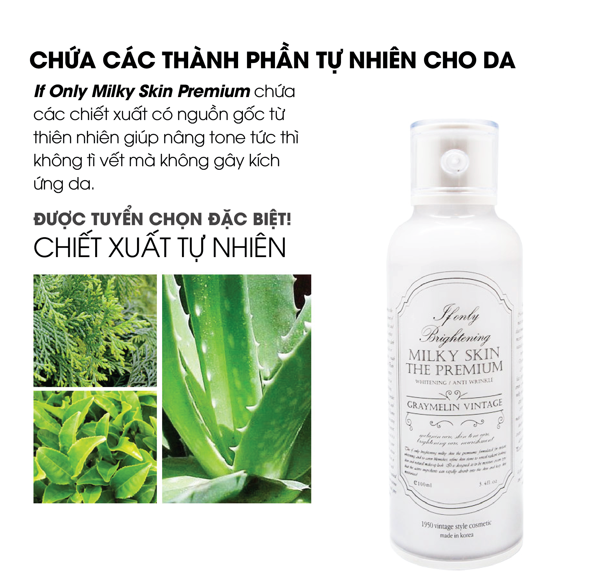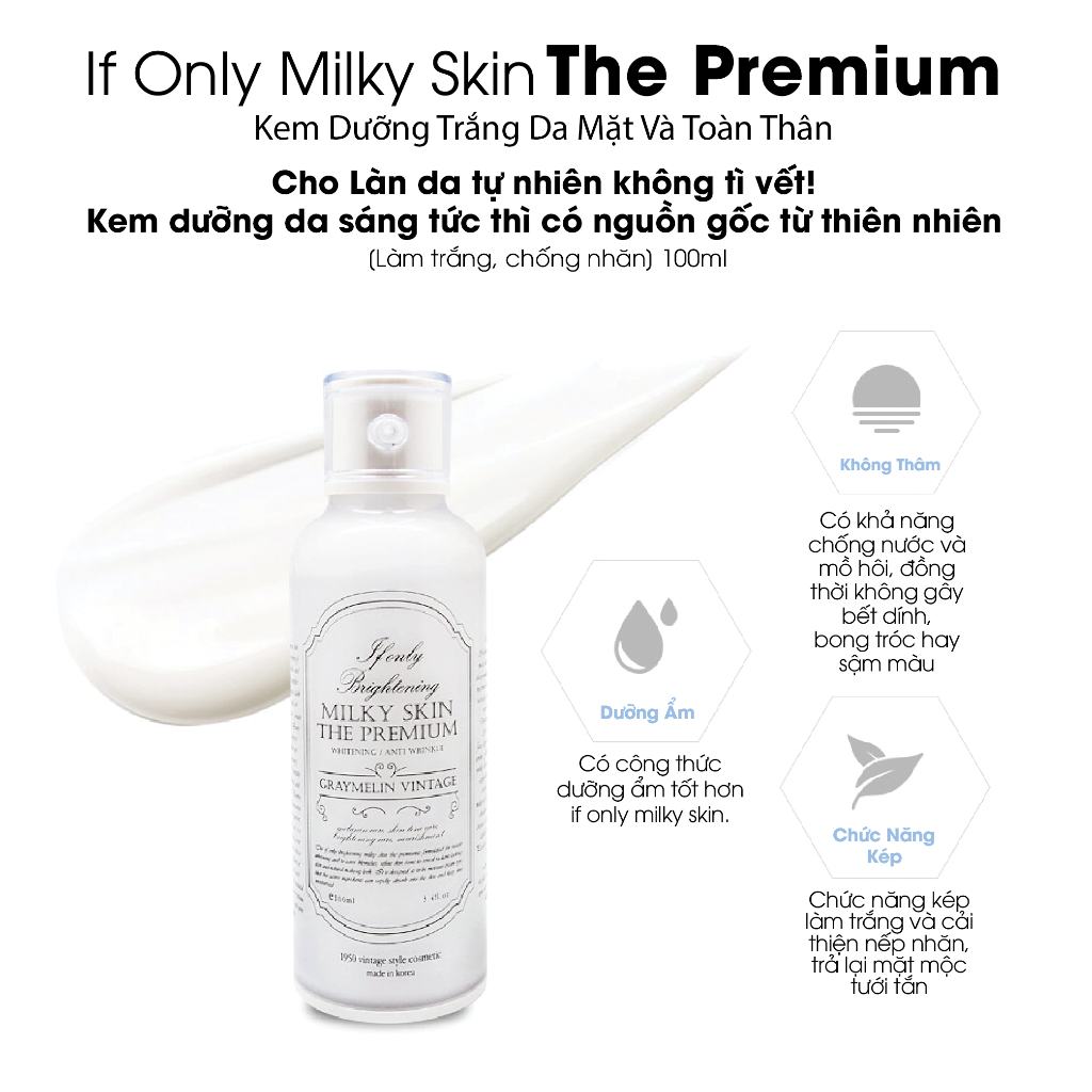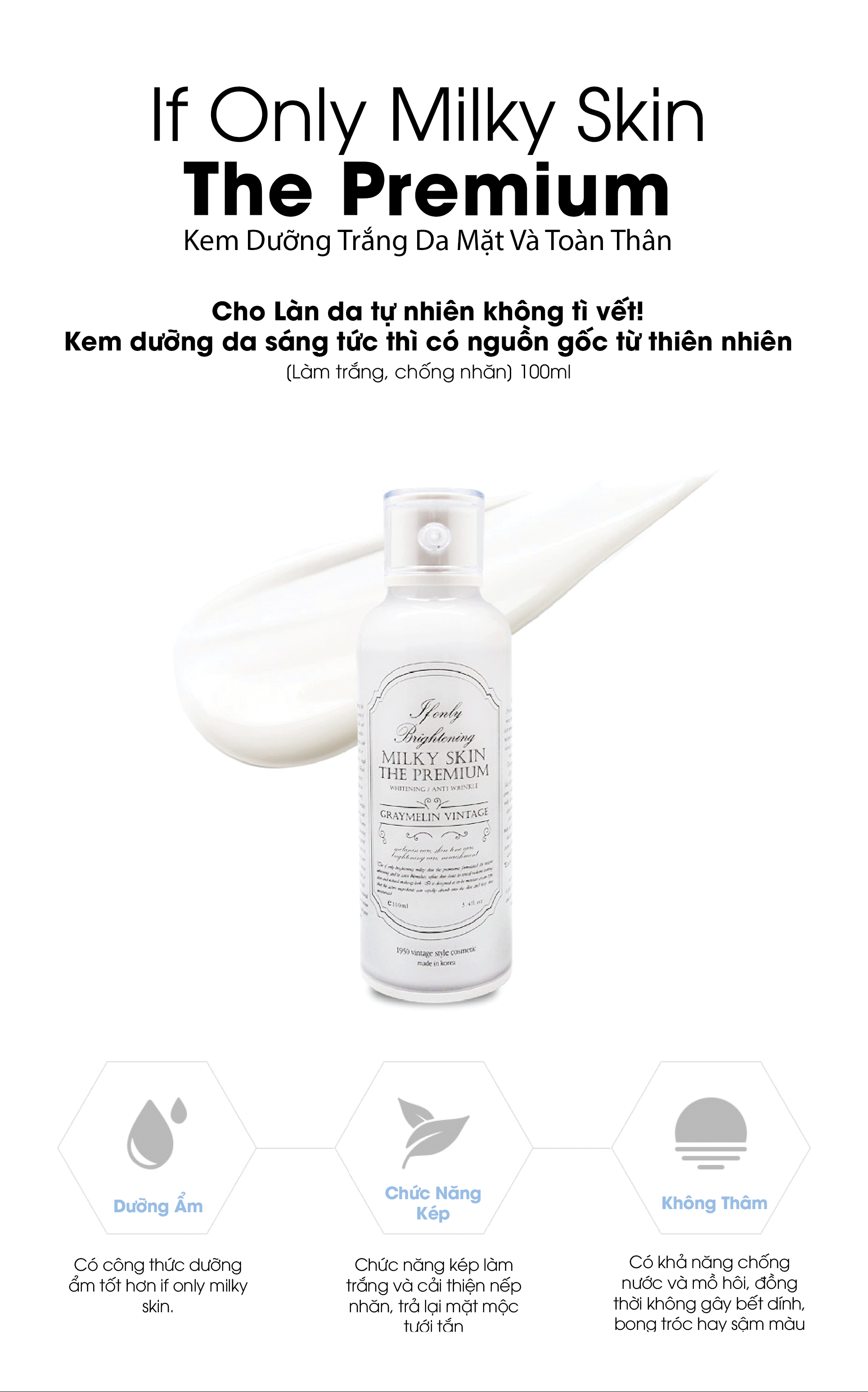 If Only Brightening Milky Skin The Premium là kem dưỡng trắng da mặt và toàn thân của thương hiệu Graymelin Vintage (Korea). Với kết cấu kem mềm như váng sữa được đánh tơi, chứa rất nhiều thành phần thiên nhiên. Sản phẩm có tính năng dưỡng trắng, bổ sung vitamin và là bí quyết hoàn hảo giúp bạn sở hữu làn da mịn màng, căng tràn sức sống và trắng hồng không tì vết! Phiên bản được thiết kế dạng chai, dung tích 100ml.