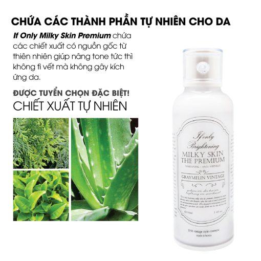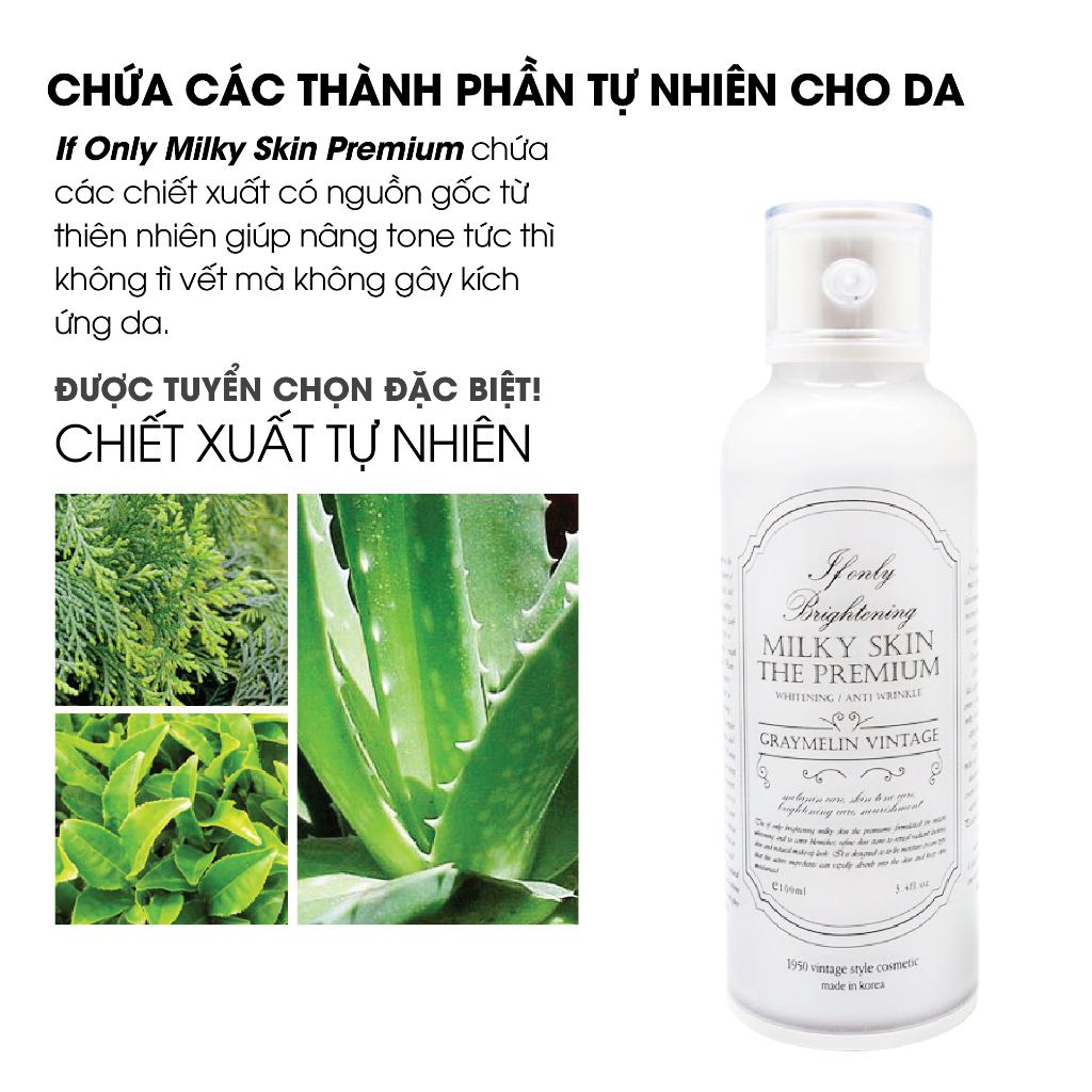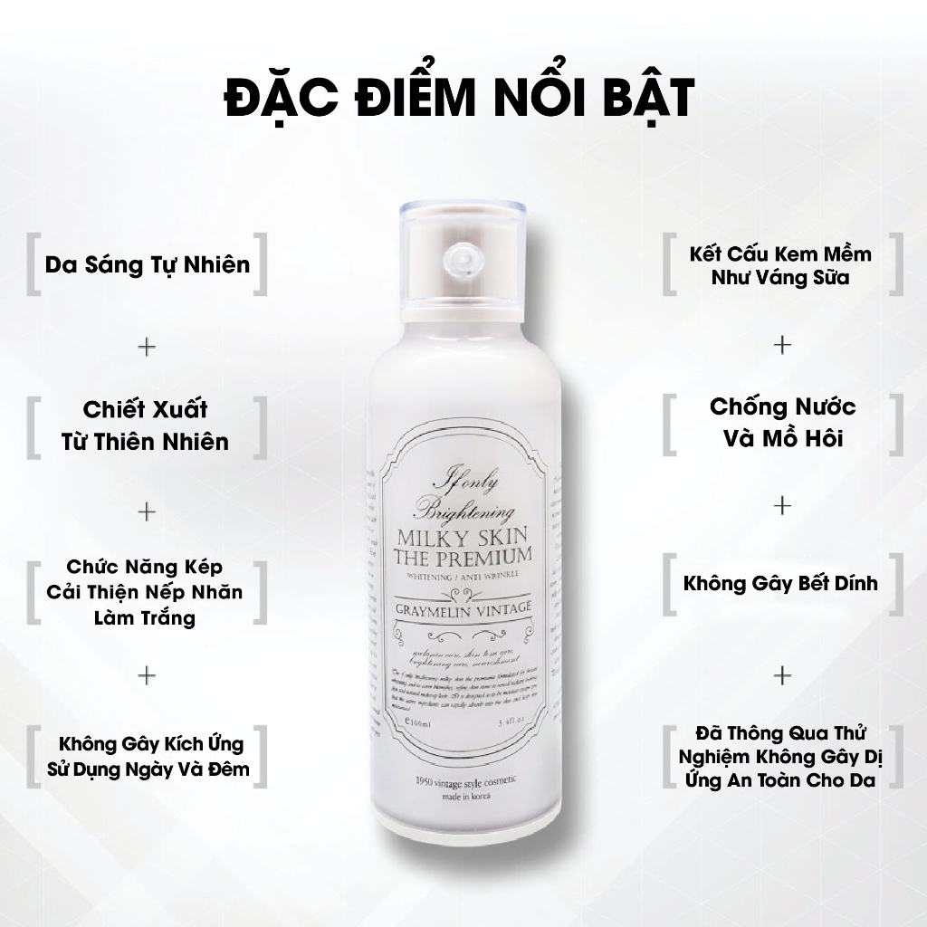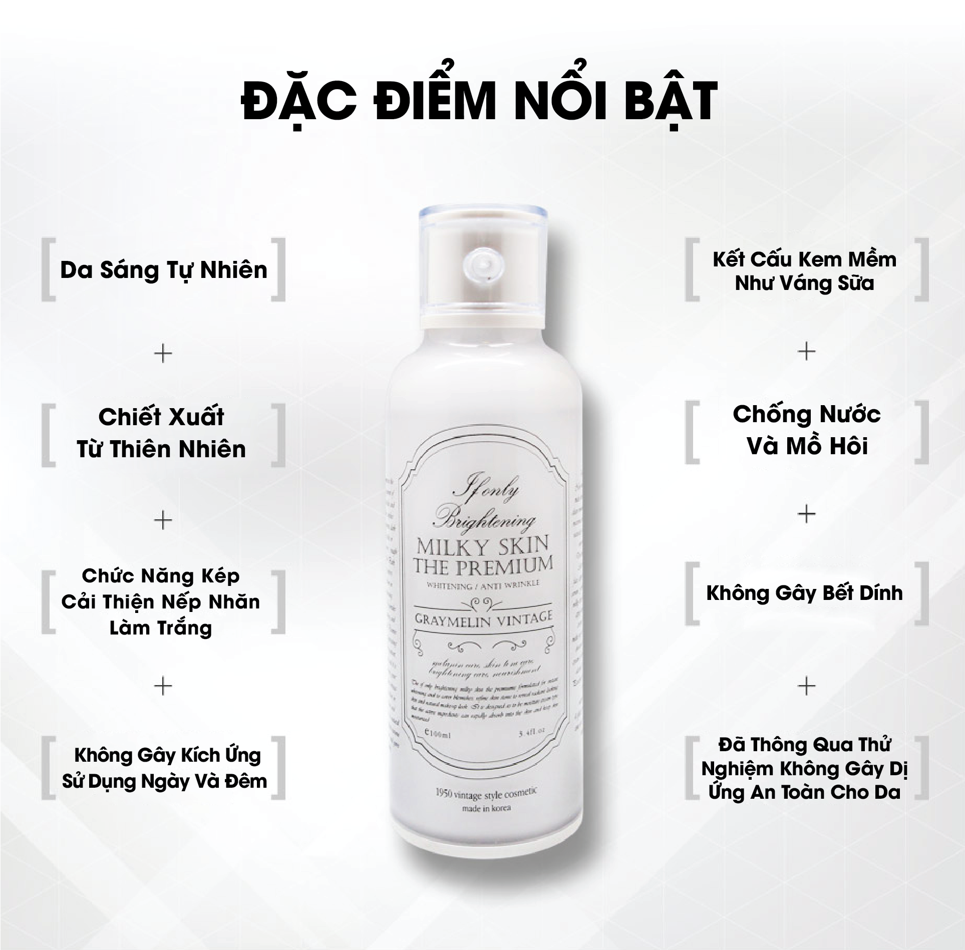 If Only Brightening Milky Skin The Premium là kem dưỡng trắng da mặt và toàn thân của thương hiệu Graymelin Vintage (Korea). Với kết cấu kem mềm như váng sữa được đánh tơi, chứa rất nhiều thành phần thiên nhiên. Sản phẩm có tính năng dưỡng trắng, bổ sung vitamin và là bí quyết hoàn hảo giúp bạn sở hữu làn da mịn màng, căng tràn sức sống và trắng hồng không tì vết! Phiên bản được thiết kế dạng chai, dung tích 100ml.