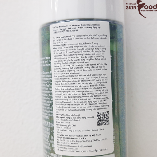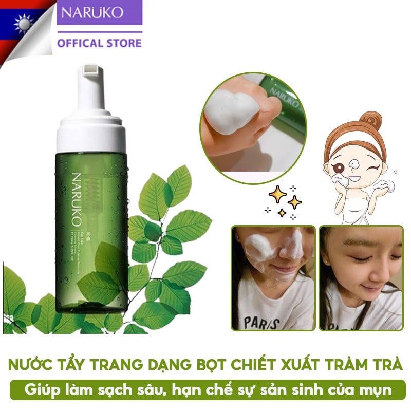 Nước Tẩy Trang Dạng Bọt Chiết Xuất Tràm Trà Naruko Tea Tree Blemish Clear Make-up Removing Cleansing Mousse là nước tẩy trang dạng bọt trà tràm Naruko tẩy sạch lớp trang điểm, các cặn son phấn, bã nhờn một cách nhẹ nhàng; làm sạch các lỗ chân lông, làm sạch tế bào chết nhẹ nhàng; hạn chế sự sinh trưởng của mụn thuộc thương hiệu Naruko đến từ Đài Loan