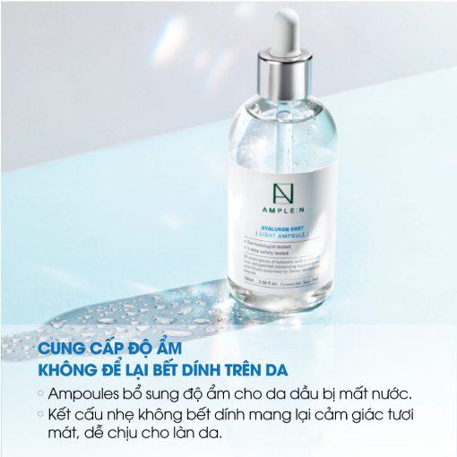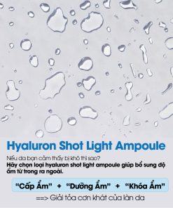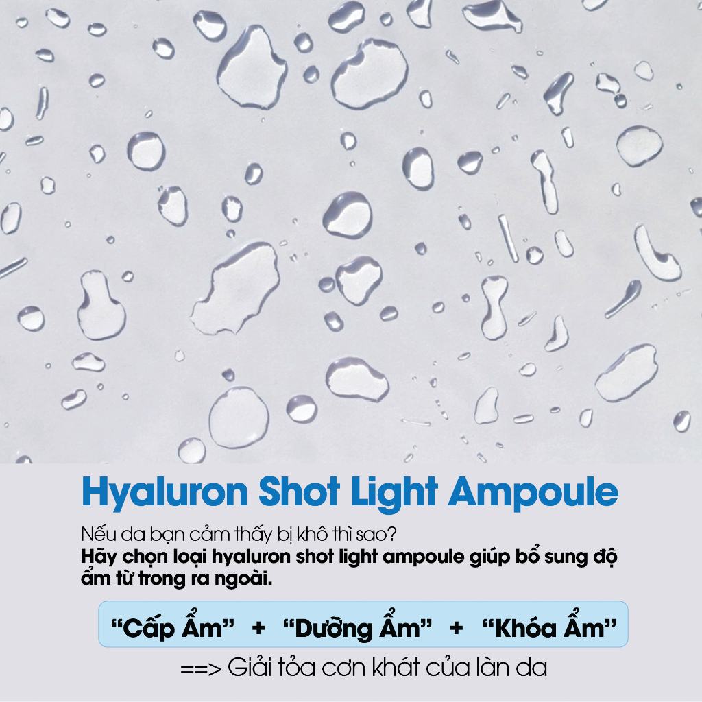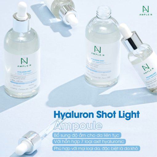 AMPLE:N Hyaluron Shot Light Ampoule được chiết xuất từ những thành phần hiệu quả cao từ kỹ thuật sản xuất tinh chất Ampoule – chăm sóc chuyên sâu cấp ẩm, khóa ẩm, giúp da mịn màng căng mướt, tăng cường độ đàn hồi của da, giúp cải thiện nếp nhăn chống lão hóa và dưỡng trắng sâu từ bên trong.