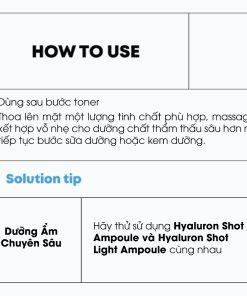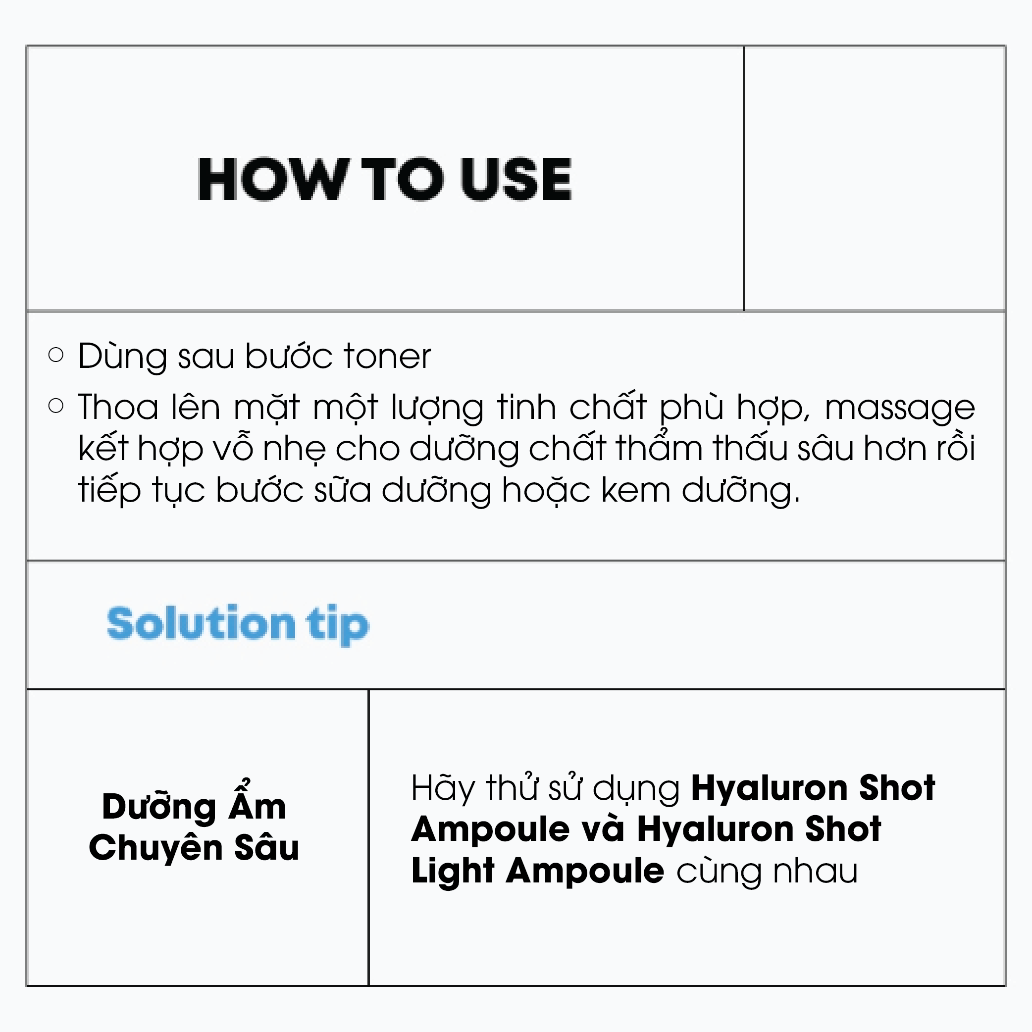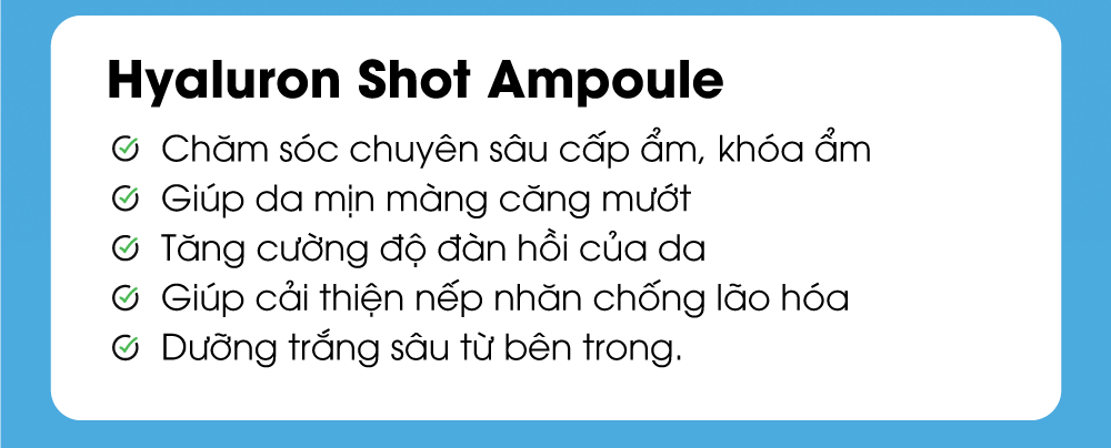 AMPLE:N Hyaluron Shot Ampoule được chiết xuất từ những thành phần hiệu quả cao từ kỹ thuật sản xuất tinh chất Ampoule – chăm sóc chuyên sâu cấp ẩm, khóa ẩm, giúp da mịn màng căng mướt, tăng cường độ đàn hồi của da, giúp cải thiện nếp nhăn chống lão hóa và dưỡng trắng sâu từ bên trong.